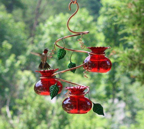 Perry's 2071R, The Vinester hummingbird feeder measures 8" wide by 12" high and holds 12 oz. of nectar.It is made out of solid copper,brass and glass.