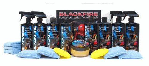 - Contains: 16 Oz. Blackfire Midnight Sun Paste Wax, 16 Oz. Blackfire Spray Sealant, 16 Oz. Blackfire Shampoo, 16 Oz. Blackfire Gloss Enhancing Polish, 16 Oz. Blackfire Interior Cleaner, 16 Oz. Blackfire Interior Protectant, 16 Oz. Blackfire Leather Conditioner, 16 Oz. Blackfire Wheel Gel & Tire Cleaner, 16 Oz. Blackfire Tire Gel, 3 Microfiber Towels, 2 Foam Wax Applicator Pads and 4 Microfiber Applicator Pads.