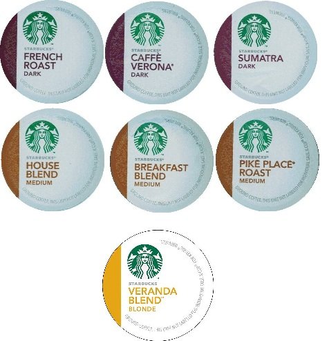 14 Count - Variety, This variety/sampler pack is a great way to try the Starbucks® Coffee K-Cup® blends. There are two K-Cups® of 7 different blends/roasts, for total of 14 Kcups 2x French Roast coffee, 2x Pike Place Roast coffee, 2x Breakfast Blend offee, 2x Sumatra coffee, 2x House Blend coffee, 2x CaffĂ© Verona® coffee, 2x Veranda blend coffee French Roast (Dark) It's our darkest and boldest and not for the faint of heart. We start with high-quality beans, which can withstand the intense fires that
