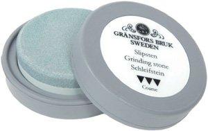 Gransfors Bruks 4034, The Gransfors ceramic grinding stone is composed of ceramic abrasives. It has a corse side with a grain size of 180 to deal with rough damages and a fine side with a grain size of 600 suitable for fine grinding and sharpening. The stone is normally used with water, but can also be used dry. The stone is round, flat with a phase around the edges to prevent chipping. The fine side is 2/3 of the total thickness. The stone comes complete with a protective rubber casing.